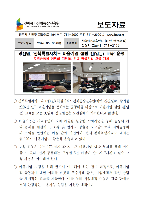 [전북경진원] 20260305_경진원 전북특별자치도 마을기업 설립 전(입문) 교육 운영 페이지 정보 작성자 관리자 작성일26-03-04 17:05 조회13회 댓글0건 관련링크 다음글 목록 본문 보도자료 댓글목록 등록된 댓글이 없습니다. 다음글 목록