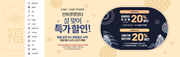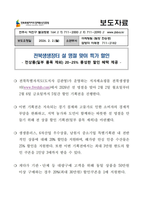 260130 보도자료 - 전북생생장터 설 명절 특별할인 페이지 정보 작성자 관리자 작성일26-02-02 17:04 조회18회 댓글0건 관련링크 이전글 다음글 목록 본문 보도자료 댓글목록 등록된 댓글이 없습니다. 이전글 다음글 목록