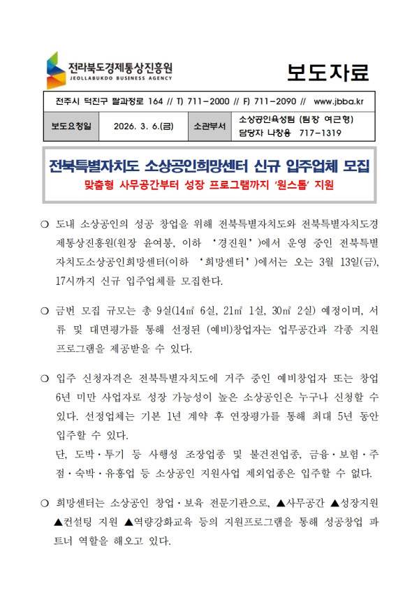 [전북경진원] 20260306_소상공인희망센터 2차 신규 입주기업 모집