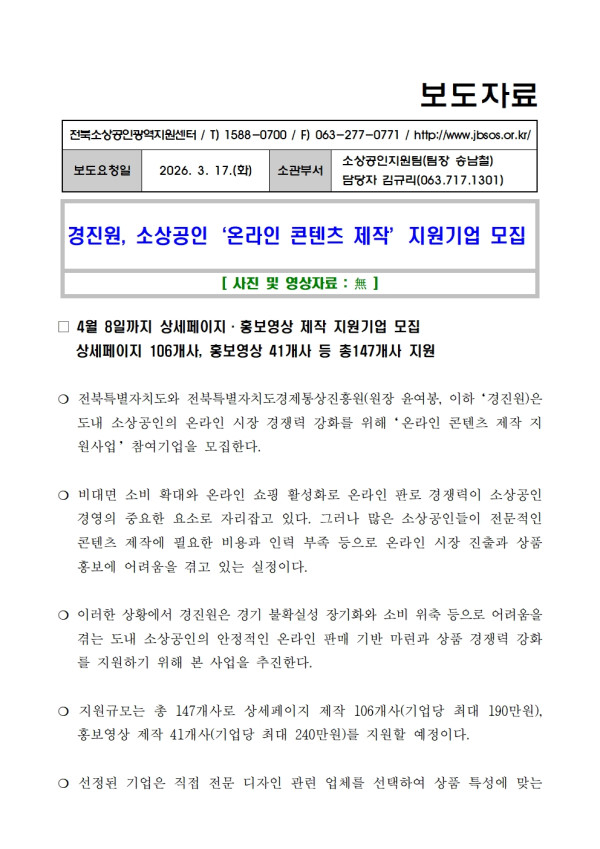 20260317_보도자료_경진원_ 소상공인 온라인 콘텐츠 제작 지원기업 모집