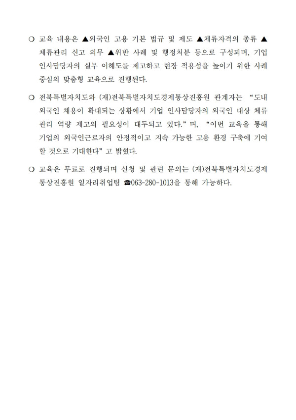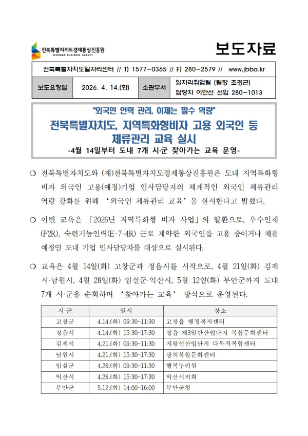 20260414_보도자료_외국인 인력 관리 이제는 필수 역량_ 전북특별자치도 외국인 체류관리 교육 실시 페이지 정보 작성자 관리자 작성일26-04-13 15:36 조회13회 댓글0건 관련링크 다음글 목록 본문 보도자료 댓글목록 등록된 댓글이 없습니다. 다음글 목록