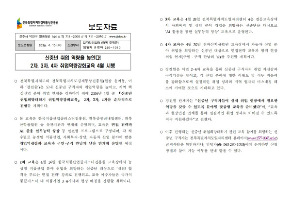 20260416_보도자료_신중년 희망더하기 취업역량강화교육 2~4차 진행 페이지 정보 작성자 관리자 작성일26-04-15 09:39 조회12회 댓글0건 관련링크 다음글 목록 본문 보도자료 댓글목록 등록된 댓글이 없습니다. 다음글 목록