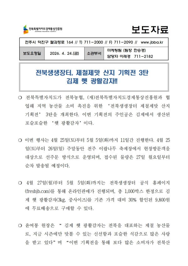 20260424_보도자료_경진원 전북생생장터 제철제맛 산지 기획전 3탄 진행 페이지 정보 작성자 관리자 작성일26-04-24 14:06 조회6회 댓글0건 관련링크 이전글 다음글 목록 본문 보도자료 댓글목록 등록된 댓글이 없습니다. 이전글 다음글 목록