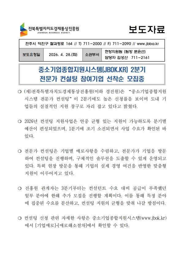 20260428_보도자료_중소기업종합지원시스템(JBOK.KR) 2분기 전문가 컨설팅 신청기업 선착순 모집 중