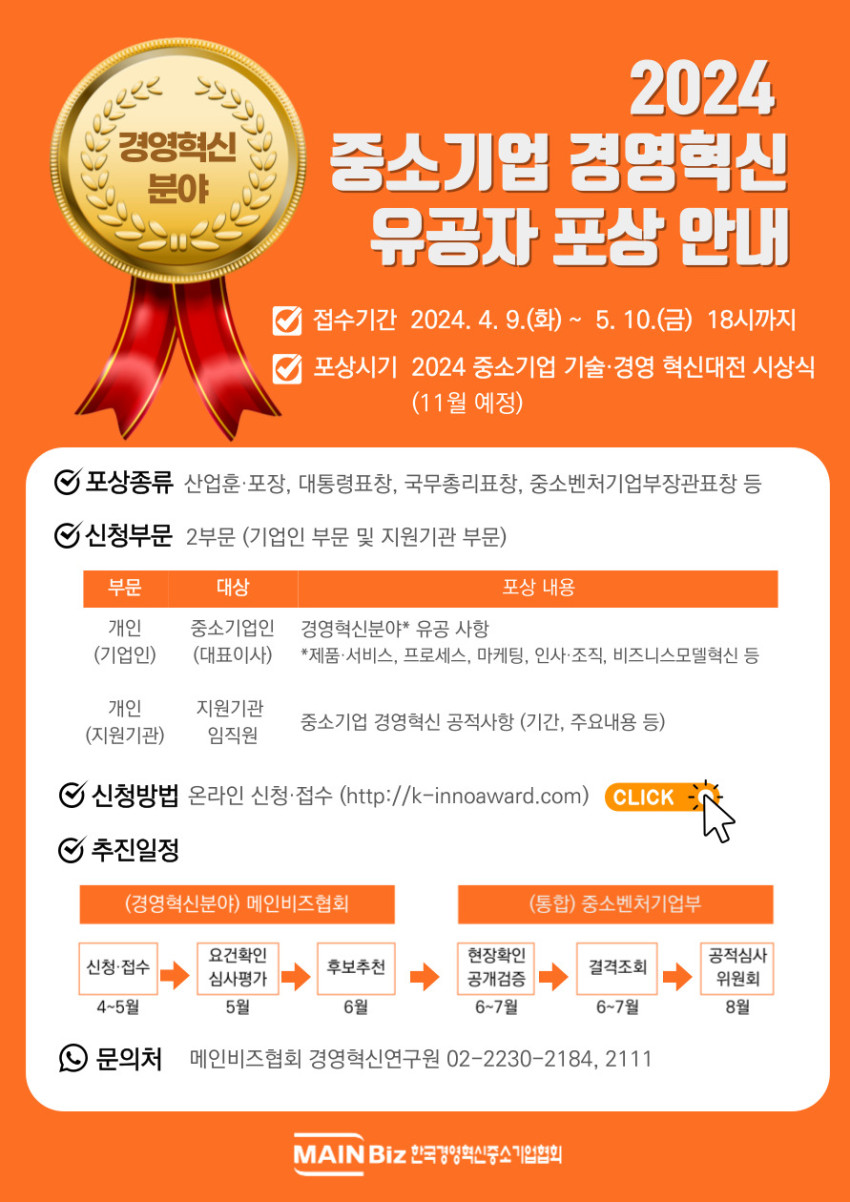 [중소벤처기업부] 「2024년 중소기업 혁신 유공」포상 후보자 모집 공고 페이지 정보 작성자 관리자 작성일24-04-25 10:11 조회2,859회 댓글0건 첨부파일 1. 모집공고_2024년 중소기업 혁신유공자 포상.hwp (76.0K) 112회 다운로드 2. 신청양식_2024년 중소기업 혁신유공자 포상경영혁신분야.hwp (178.0K) 107회 다운로드 관련링크 이전글 다음글 목록 본문 댓글목록 등록된 댓글이 없습니다. 이전글 다음글 목록