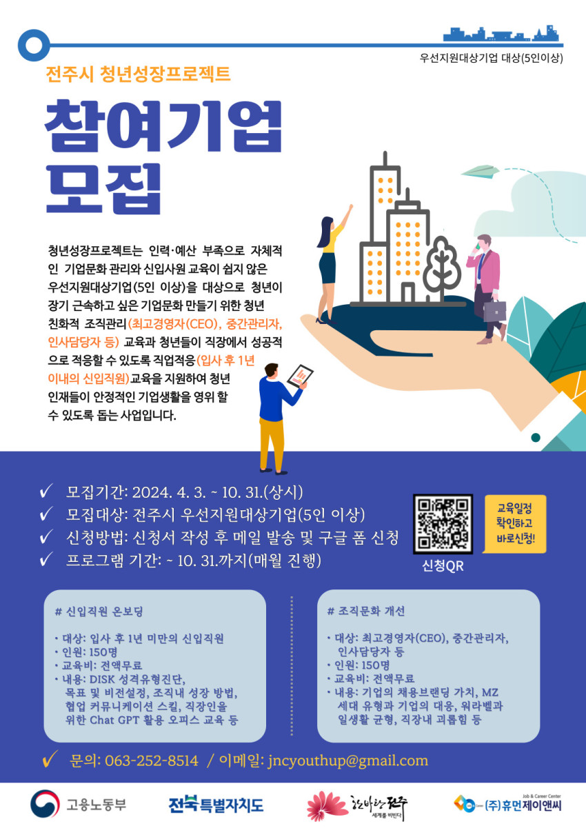 [전주시청년성장사업단] 조직문화 개선교육 지원 참여기업 모집 페이지 정보 작성자 한세은 작성일24-04-26 15:47 조회2,879회 댓글0건 관련링크 이전글 다음글 목록 본문 댓글목록 등록된 댓글이 없습니다. 이전글 다음글 목록