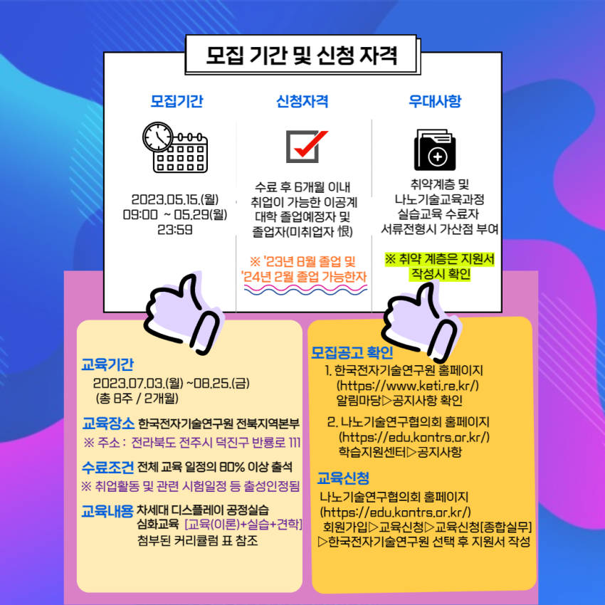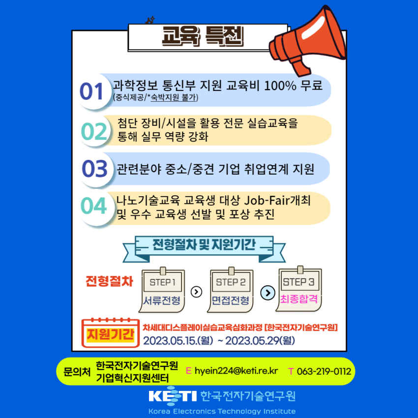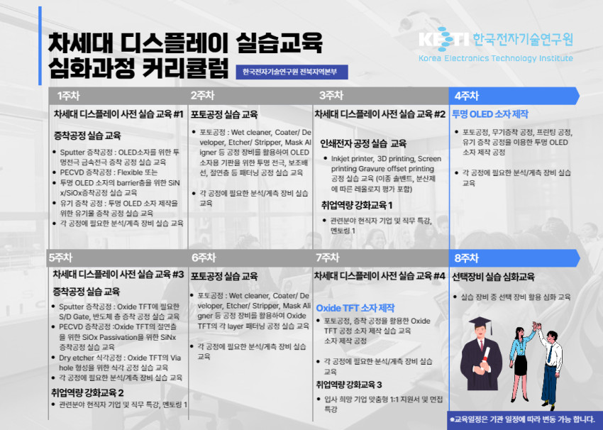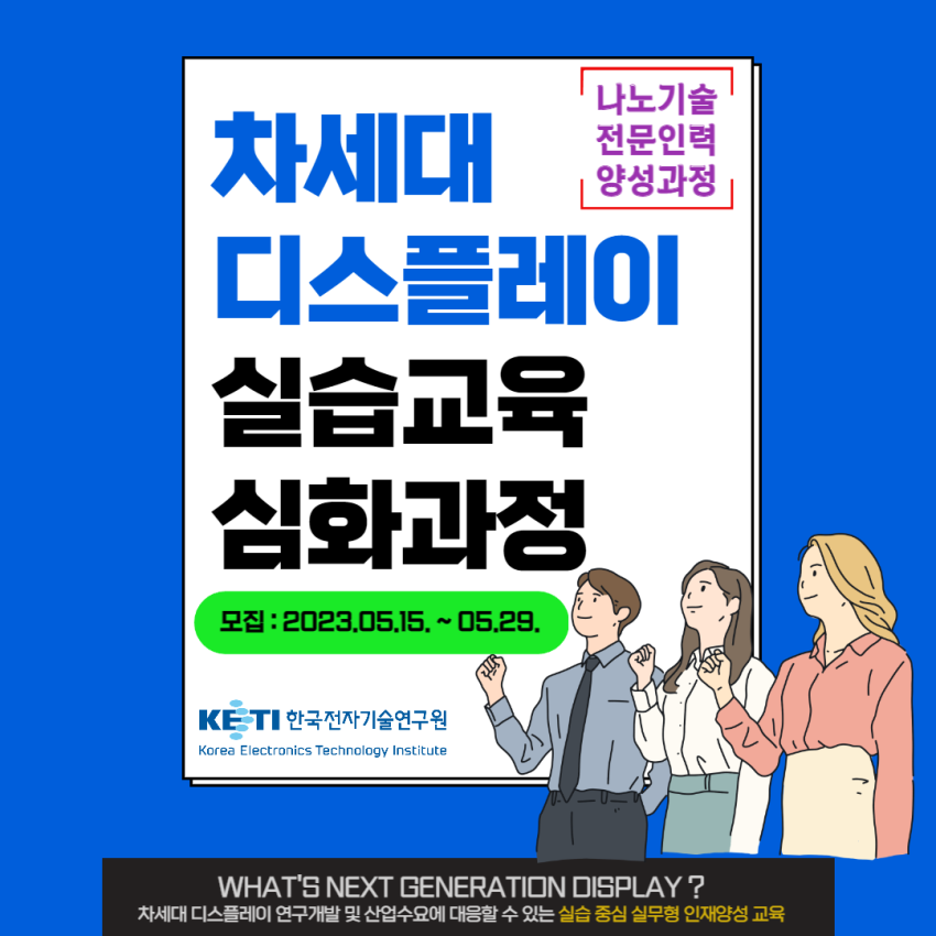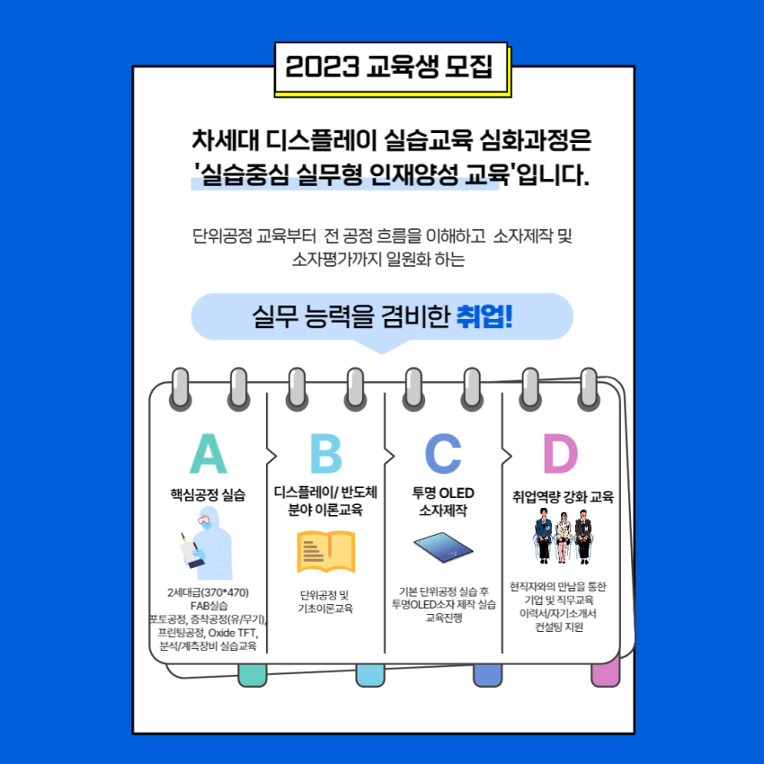 2023 차세대 디스플레이 실습교육 심화과정 교육생 모집 페이지 정보 작성자 정희 작성일23-05-16 14:16 조회3,298회 댓글0건 첨부파일 [붙임1][종합실무과정] 2023 차세대 디스플레이 실습교육 심화과정 모집 안내.pdf (264.1K) 215회 다운로드 관련링크 https://edu.kontrs.or.kr/home/kor/main.do 1658회 연결 이전글 다음글 목록 본문 댓글목록 등록된 댓글이 없습니다. 이전글 다음글 목록