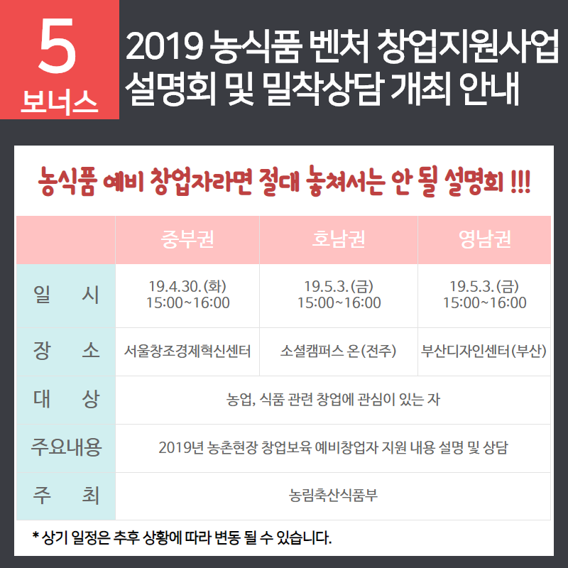 - 중부권: 4월 30일(화) 15:00~16:00 / 서울창조경제혁신센터(용산) S-라운지(1층)
