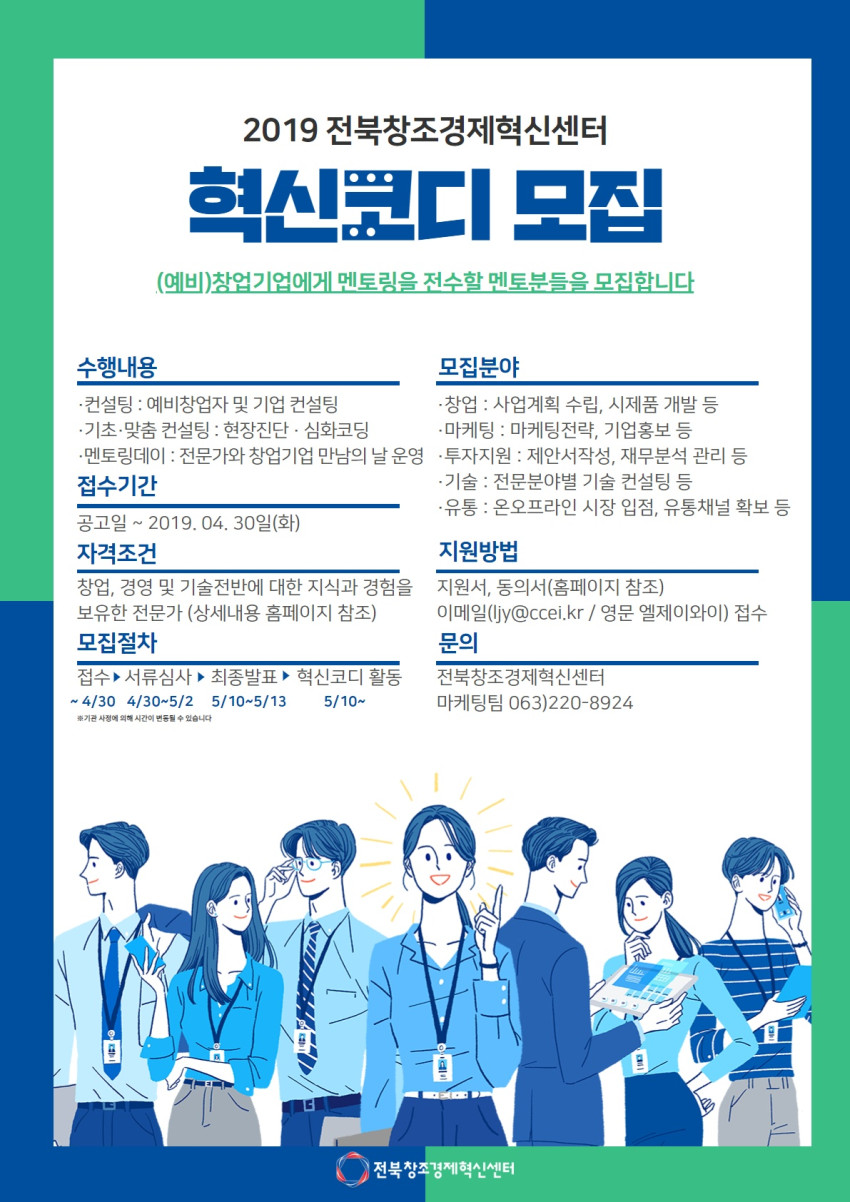 도내 (예비)창업기업에게 맞춤형 컨설팅 지원프로그램을 통하여 내실 있고 건전한 기업을 발굴·육성하며 지속가능한 전북기업 모델을 구축을 위한 멘토링을 지원할「2019 전북창조경제혁신센터 혁신코디(멘토)」을 다음과 같이 모집하오니 많은 관심과 신청 바랍니다.