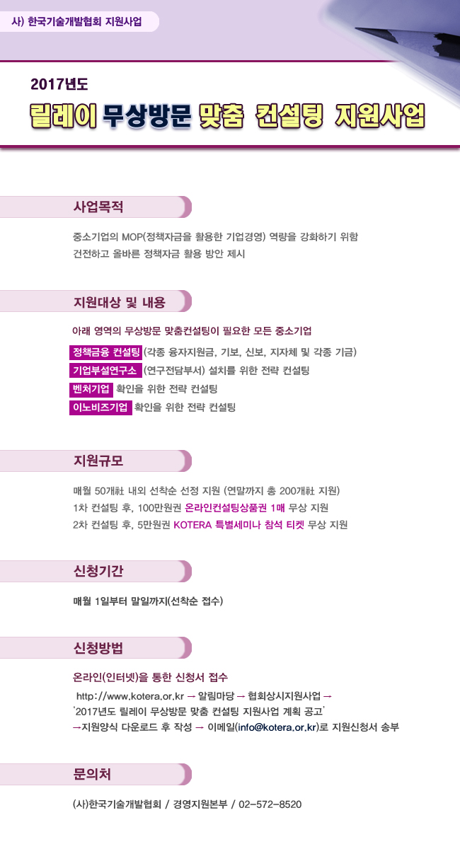 한국기술개발협회는 “2017년도 정책자금 릴레이 무상방문 맞춤 컨설팅 지원사업”을 통해 중소기업의 MOP (Management of Policyfund ; 정책자금을 활용한 기업경영) 역량 강화하고, 건전하고 올바른 정책자금 활용 방안을 제시하기 위하여 동 지원 사업 계획을 아래와 같이 공고하니 중소기업의 많은 참여를 바랍니다.
