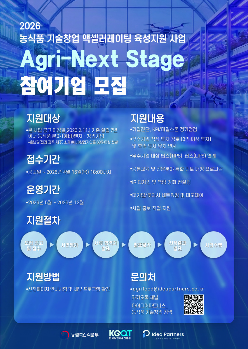 1. 농림축산식품부 및 한국농업기술진흥원과 함께 추진하는 「2026년 농식품 기술창업 액셀러레이터 육성지원사업 ? Agri-Next Stage」 참여기업을 모집합니다.