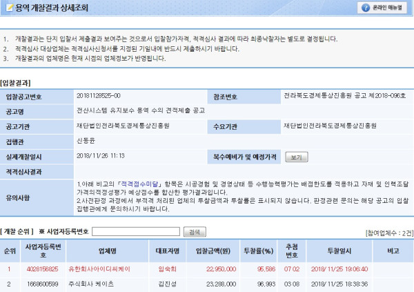 개찰결과 | 전산시스템 유지보수 용역 수의 견적제출 공고 개찰결과 페이지 정보 작성자 신동윤 작성일18-11-29 10:41 조회3,024회 댓글0건 관련링크 이전글 다음글 목록 본문 세부정보 공고번호 전산시스템 유지보수 용역 수의 견적제출 공고 개찰결과 댓글목록 등록된 댓글이 없습니다. 이전글 다음글 목록