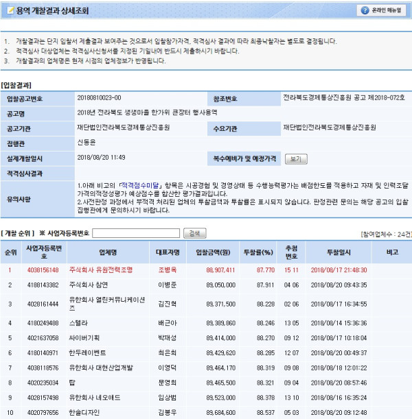 개찰결과 | 2018년 전라북도 생생마을 한가위 큰장터 행사용역 개찰결과 페이지 정보 작성자 신동윤 작성일18-08-30 09:14 조회1,571회 댓글0건 관련링크 이전글 다음글 목록 본문 세부정보 공고번호 2018년 전라북도 생생마을 한가위 큰장터 행사용역 개찰결과 댓글목록 등록된 댓글이 없습니다. 이전글 다음글 목록