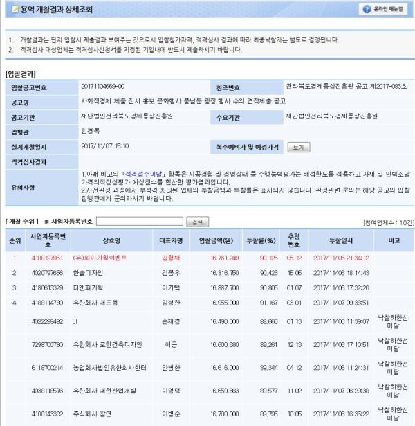 개찰결과 | 사회적경제 제품 전시 홍보 문화행사 풍남문 광장 행사 개찰결과 페이지 정보 작성자 민경록 작성일17-11-13 16:43 조회1,570회 댓글0건 관련링크 이전글 다음글 목록 본문 세부정보 공고번호 사회적경제 제품 전시 홍보 문화행사 풍남문 광장 행사 개찰결과 댓글목록 등록된 댓글이 없습니다. 이전글 다음글 목록