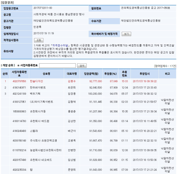 개찰결과 | 사회적경제 제품 전시홍보 풍남문 행사 개찰결과 페이지 정보 작성자 민경록 작성일17-07-26 09:22 조회1,505회 댓글0건 관련링크 이전글 다음글 목록 본문 세부정보 공고번호 사회적경제 제품 전시홍보 풍남문 행사 개찰결과 댓글목록 등록된 댓글이 없습니다. 이전글 다음글 목록