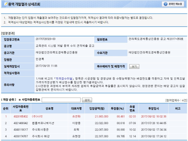 개찰결과 | 교육관리 시스템 개발 용역 개찰결과 페이지 정보 작성자 민경록 작성일17-08-03 15:15 조회2,197회 댓글0건 관련링크 이전글 다음글 목록 본문 세부정보 공고번호 교육관리 시스템 개발 용역 개찰결과 댓글목록 등록된 댓글이 없습니다. 이전글 다음글 목록